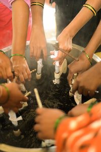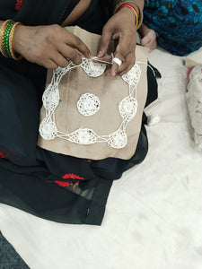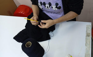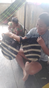 Sustainably harvested chambira in the Peruvian Amazon. Collected, hand spun, hand dyed and knitted using an ancestral technique with one needle. Made my the Boras women.